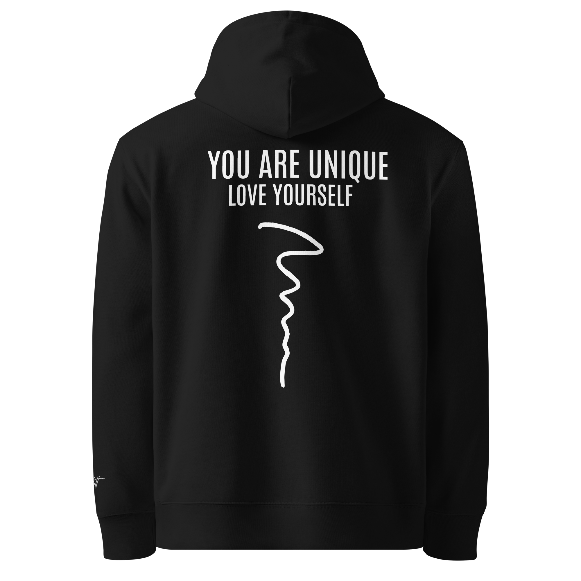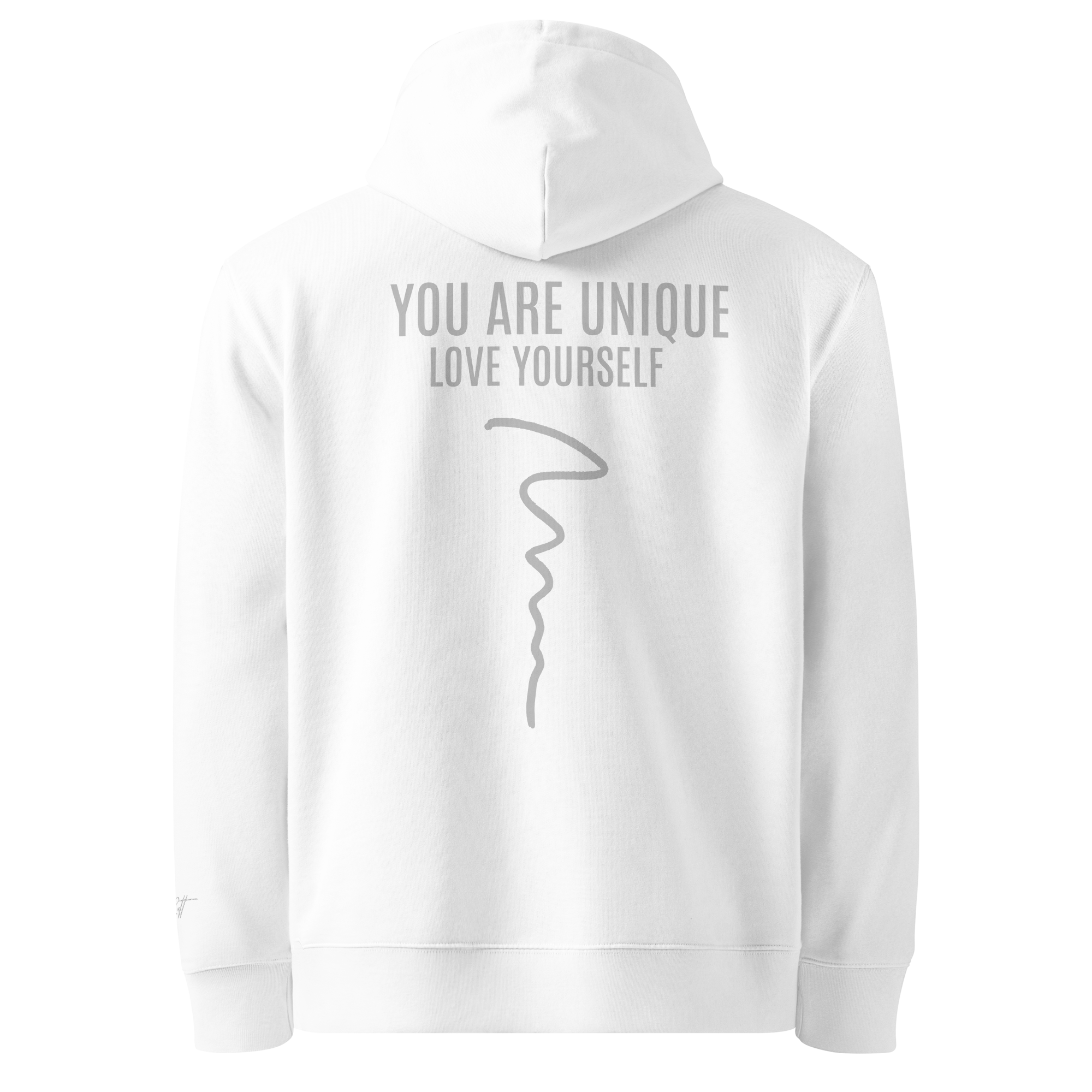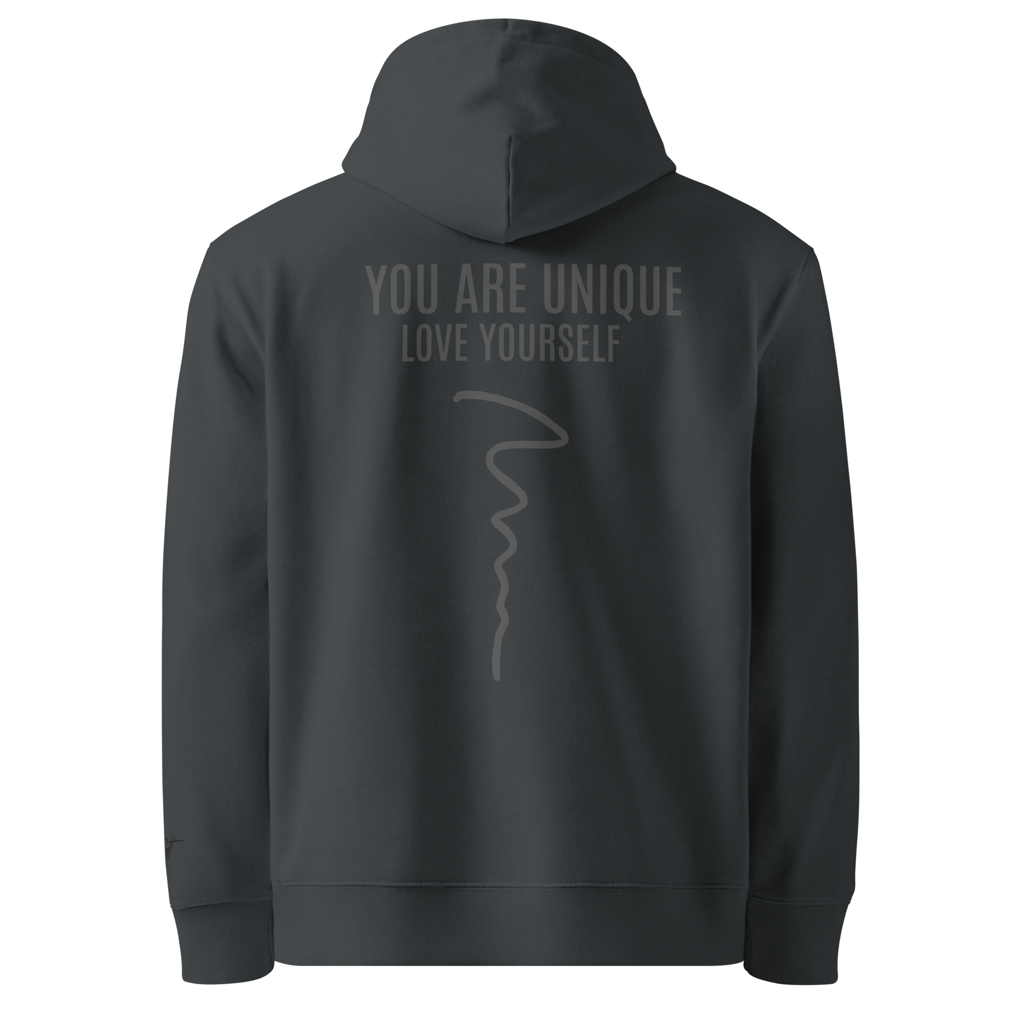‣ Printed Identity – The back of the garment features a powerful printed affirmation: YOU ARE UNIQUE, with the phrase LOVE YOURSELF printed just beneath in smaller type. A flowing squiggle line runs vertically down the spine, adding movement and symbolic depth. This design is a reminder that your path is your own—imperfect, beautiful, and worthy of love at every step.
