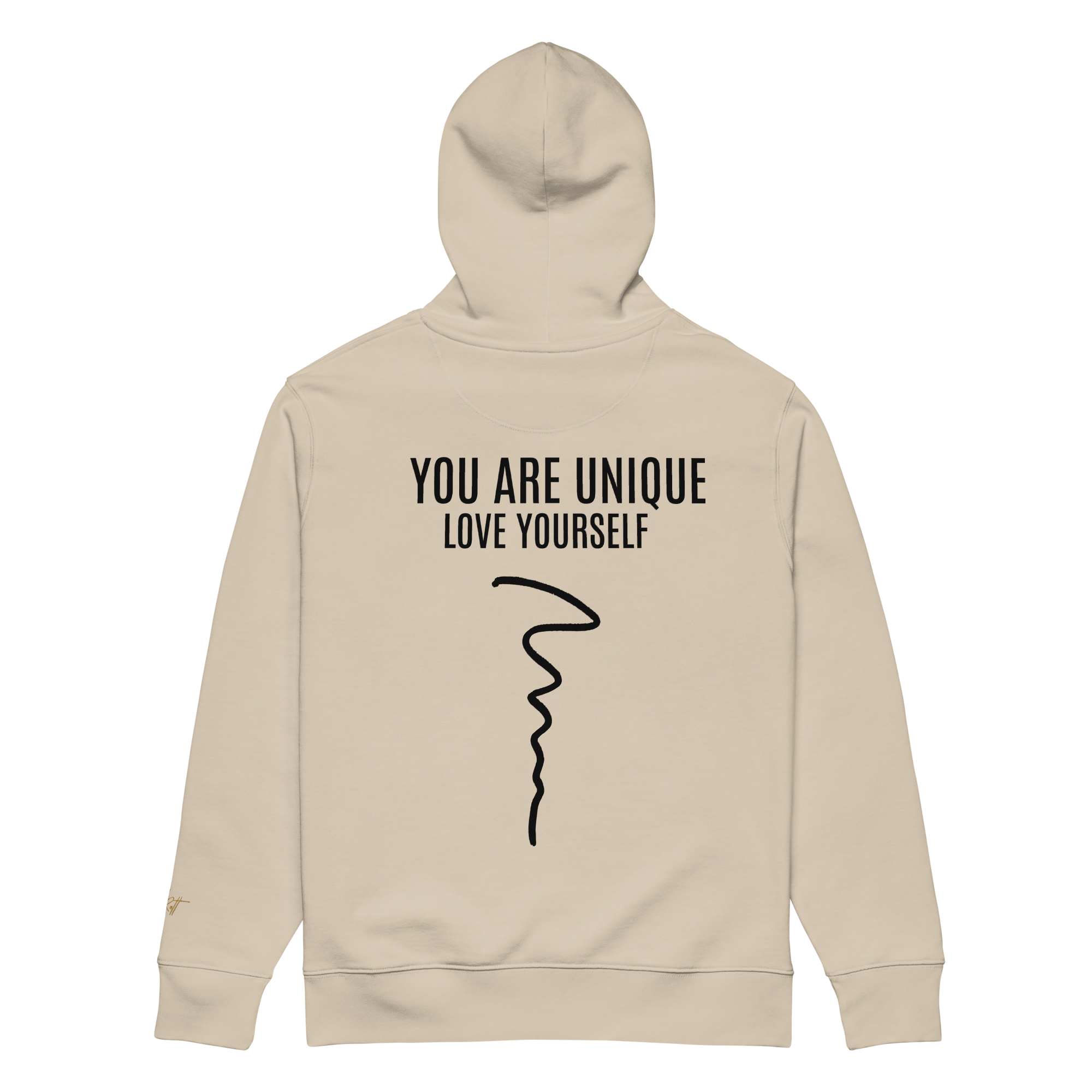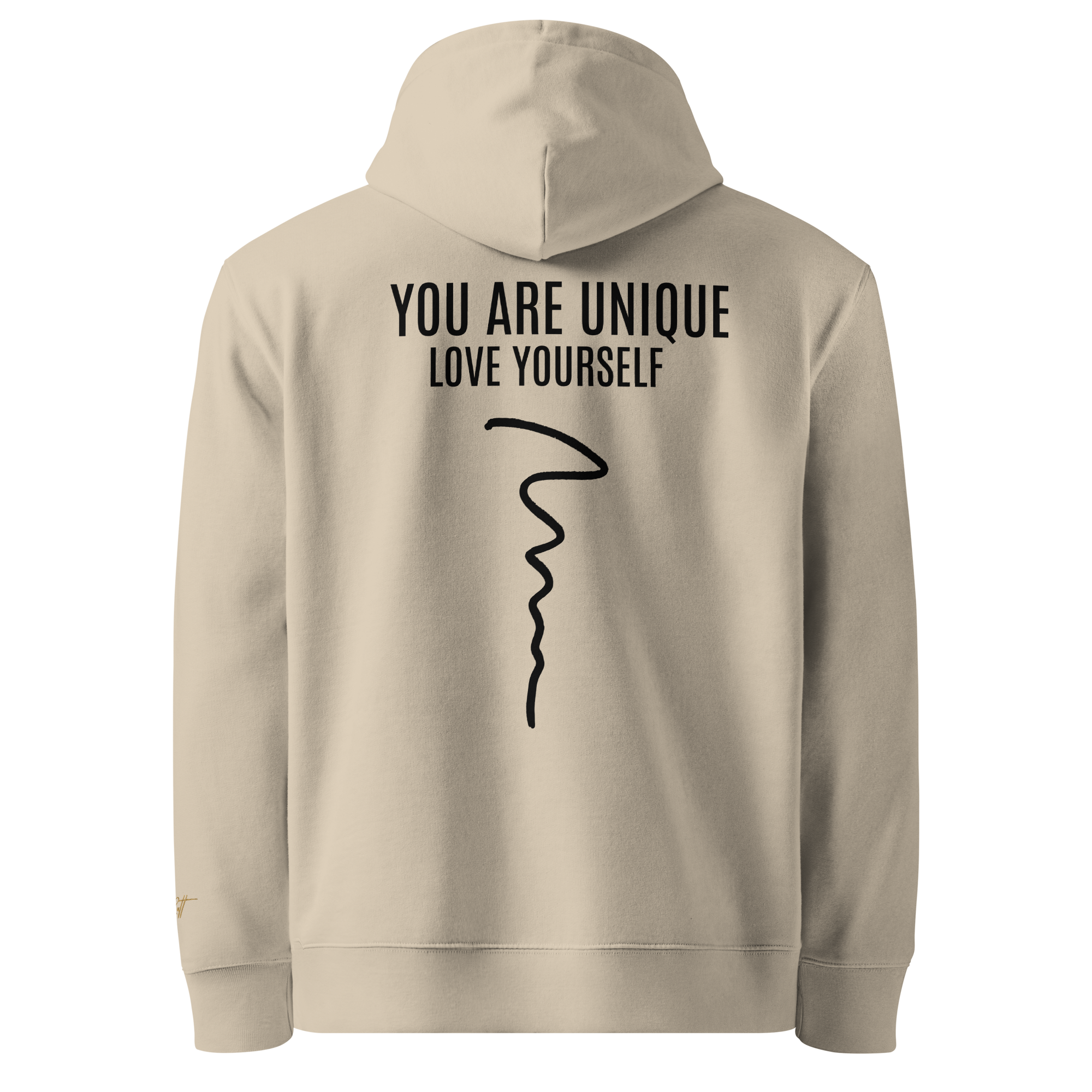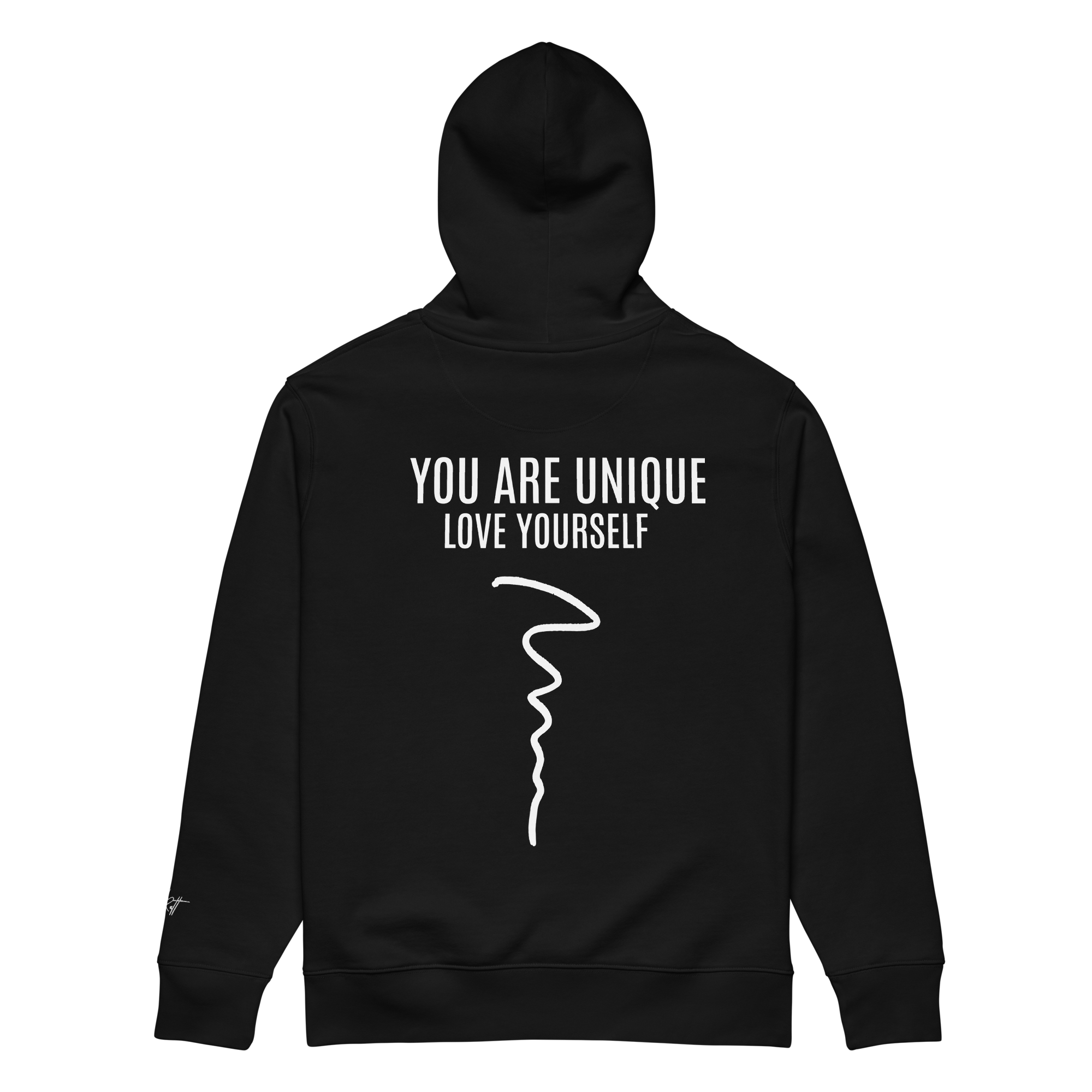 ‣ Printed Identity – The back of the garment features a powerful printed affirmation: YOU ARE UNIQUE, with the phrase LOVE YOURSELF printed just beneath in smaller type. A flowing squiggle line runs vertically down the spine, adding movement and symbolic depth. This design is a reminder that your path is your own—imperfect, beautiful, and worthy of love at every step.