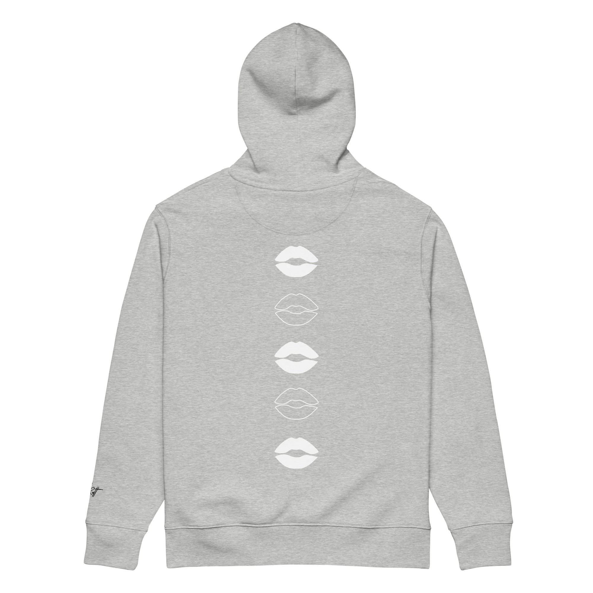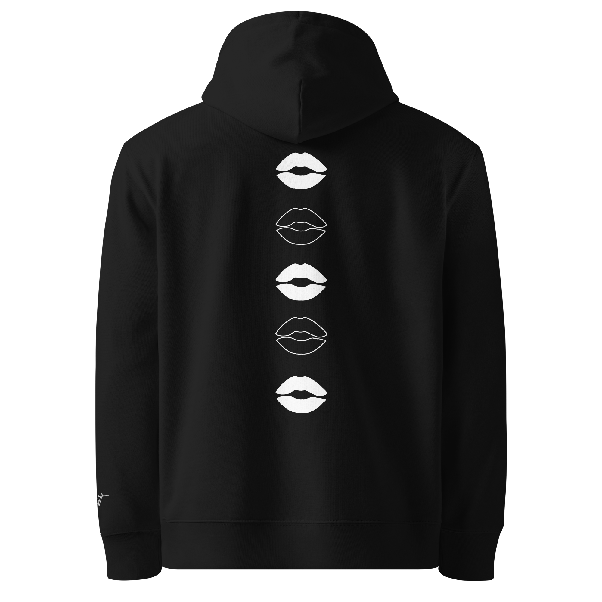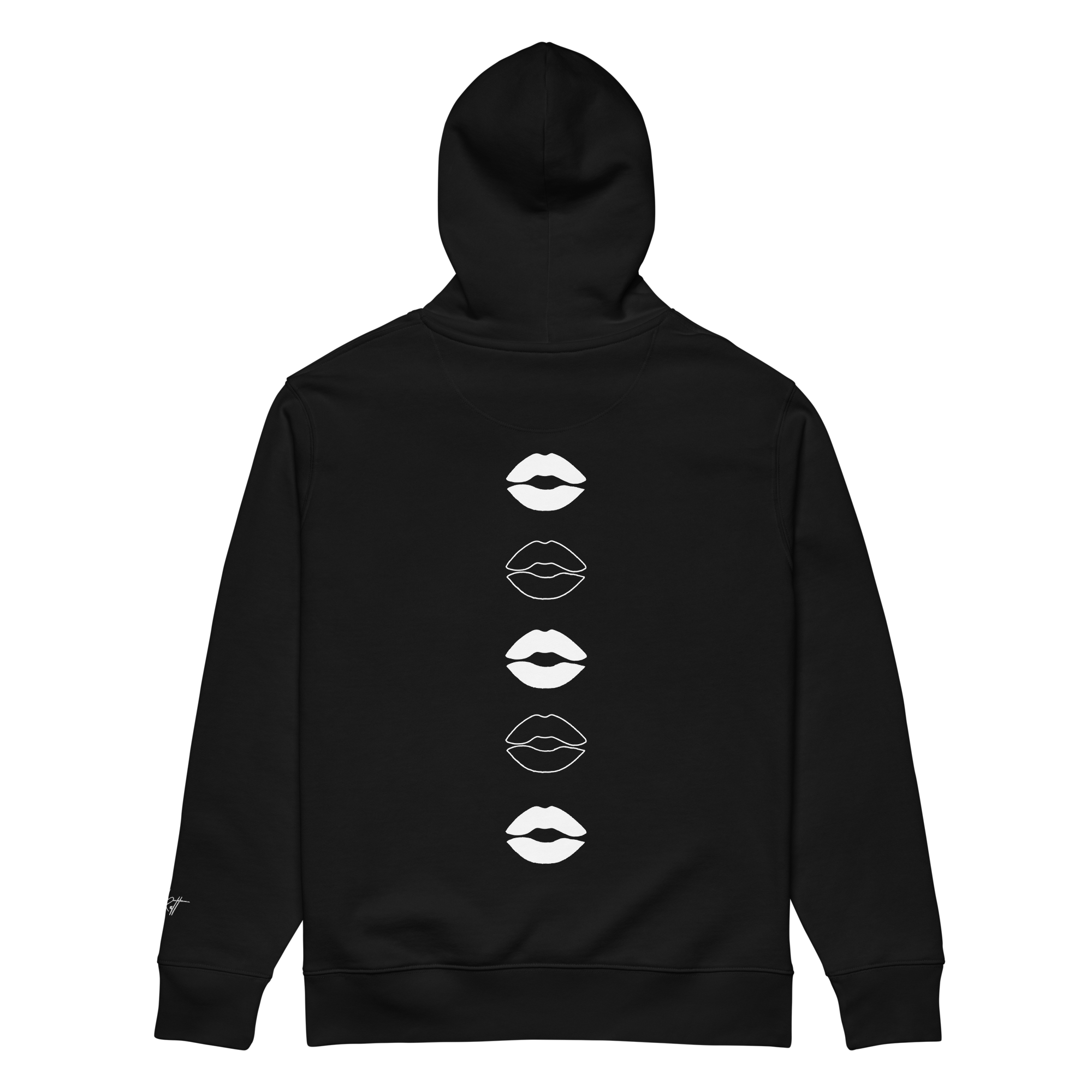 ‣ Symbolic Details – On the back, a vertical printed design features a cascade of outlined lip silhouettes flowing down the spine. These lips are more than playful—they’re symbols of affection, expression, and the power of voice. They represent the kisses blown in support, the words of encouragement whispered in confidence, and the unapologetic joy of being seen and celebrated.