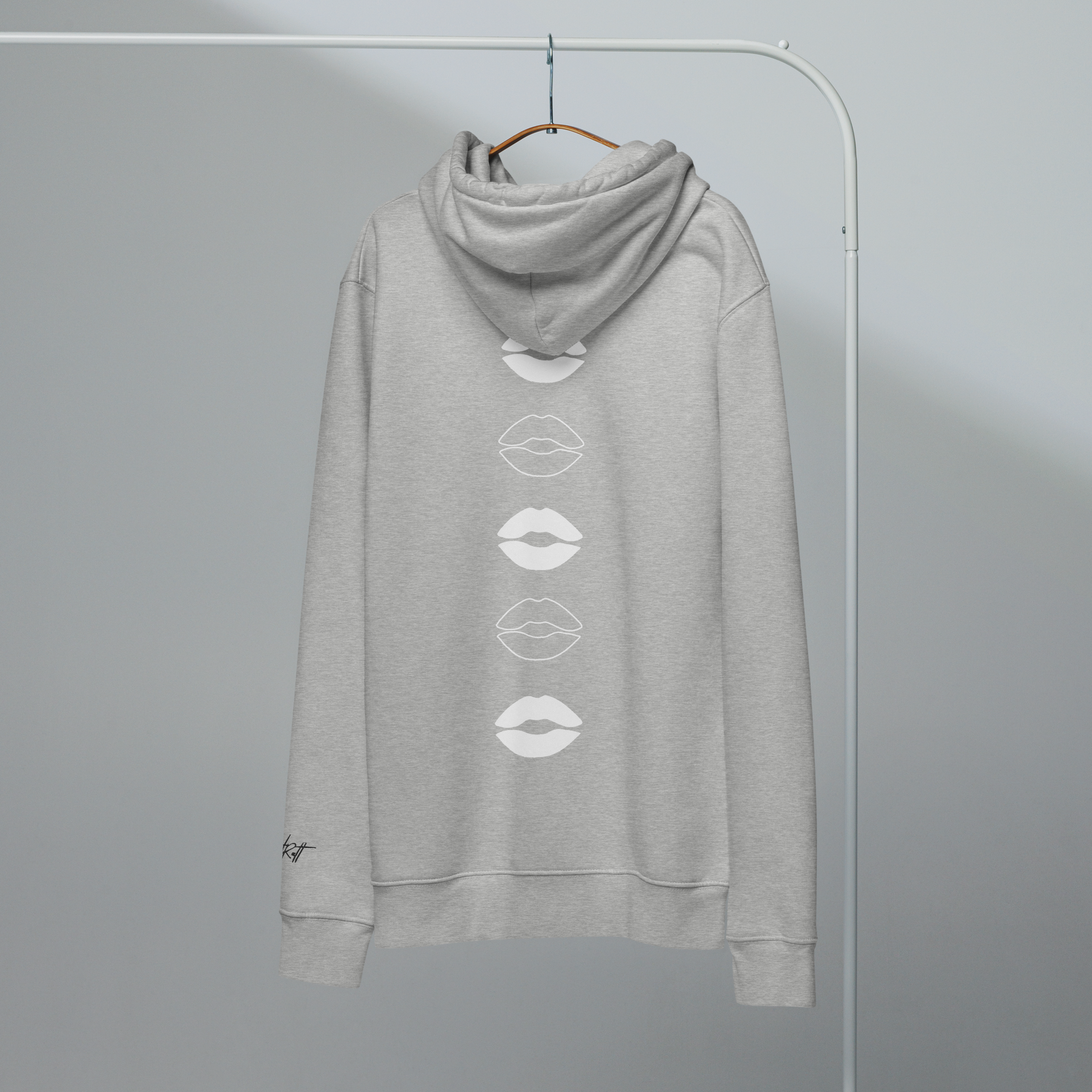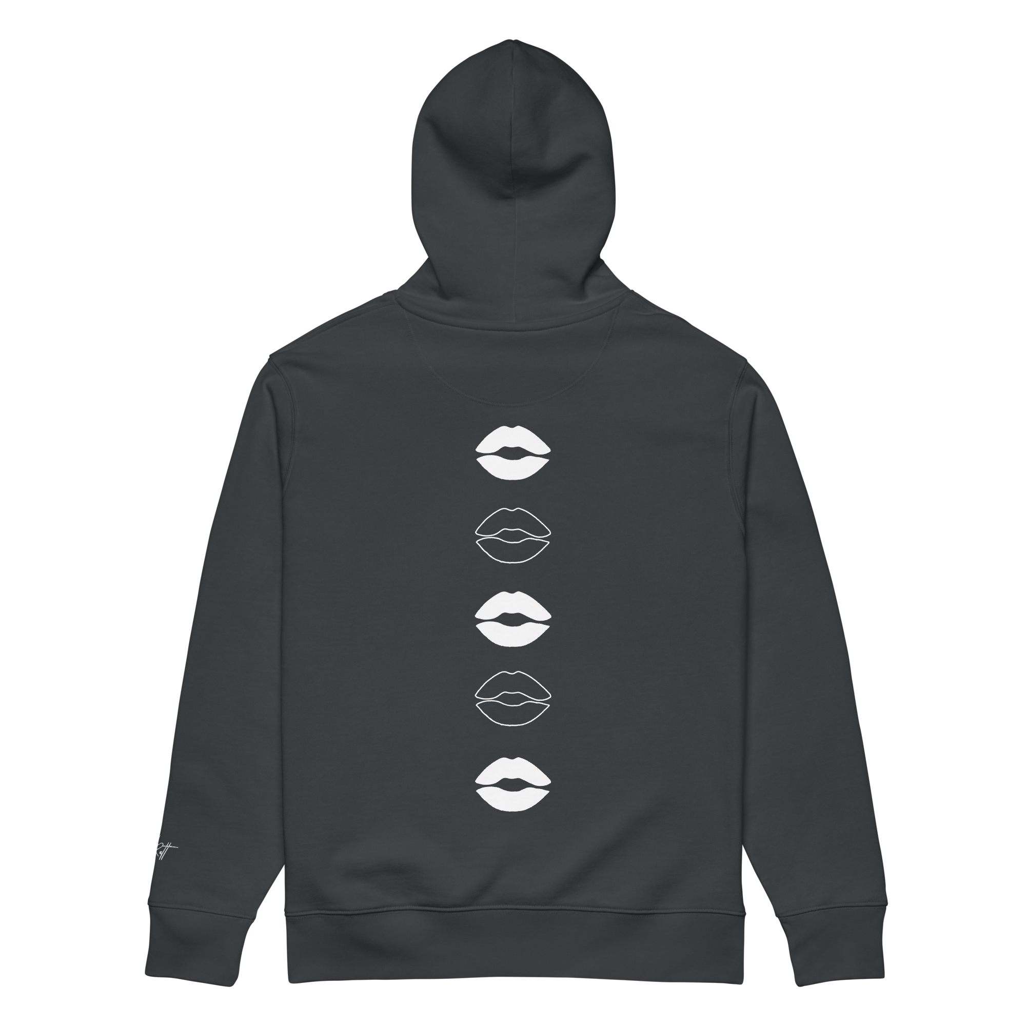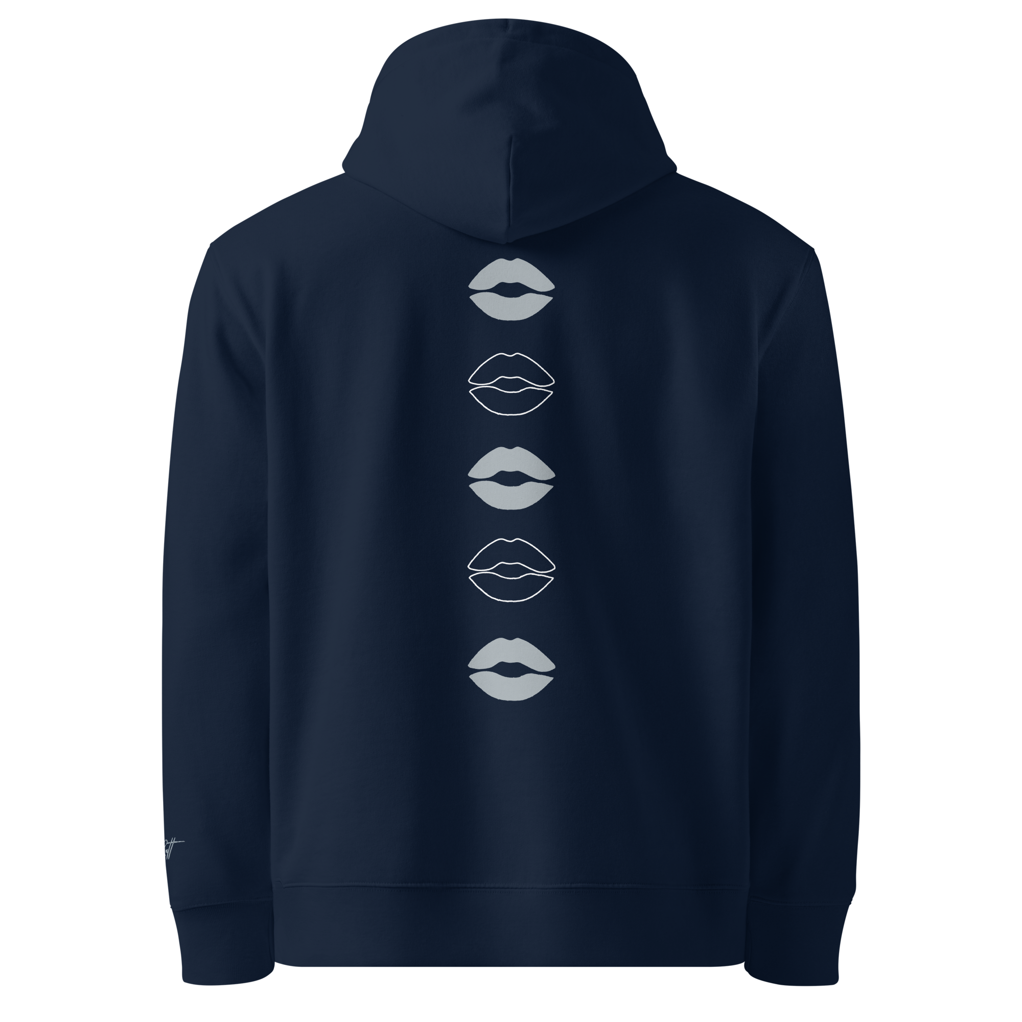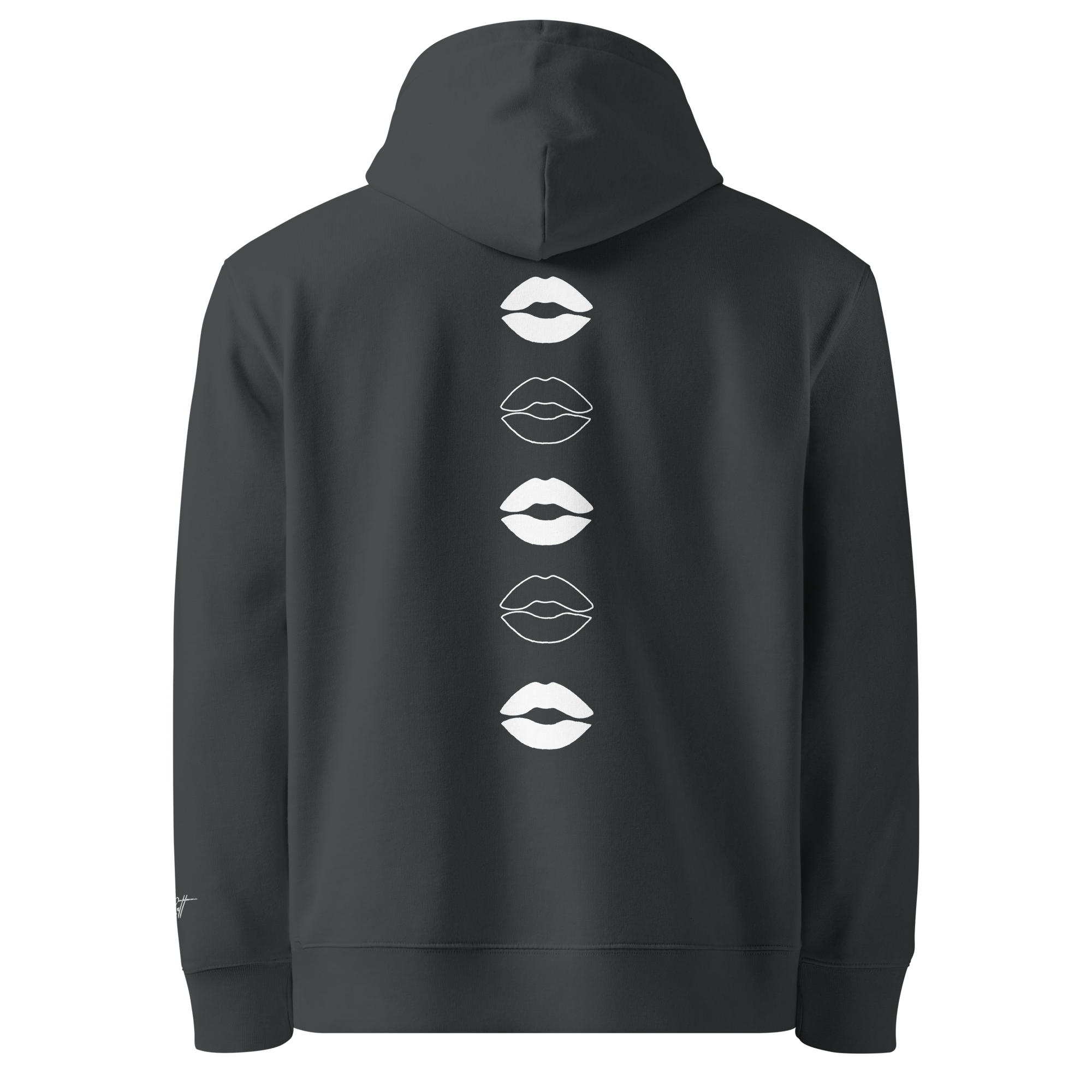 ‣ Symbolic Details – On the back, a vertical printed design features a cascade of outlined lip silhouettes flowing down the spine. These lips are more than playful—they’re symbols of affection, expression, and the power of voice. They represent the kisses blown in support, the words of encouragement whispered in confidence, and the unapologetic joy of being seen and celebrated.